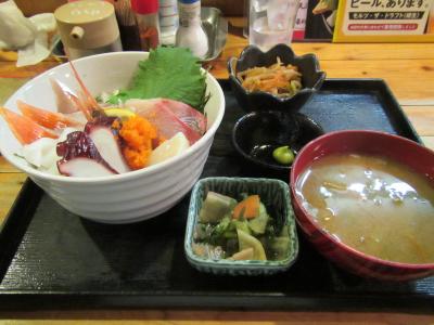 海鮮丼を注文。新鮮な海産物がふんだんに使われており、小鉢・香の物・味噌汁がついて734円という安さ。