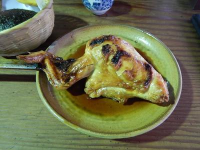 山賊焼きは鶏肉を生からじっくり焼いたもので太い竹串に刺さっている。タレがかかっていてうまい。気にせず手づかみで食べて骨と串に解体していくのがよい。
