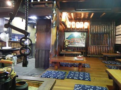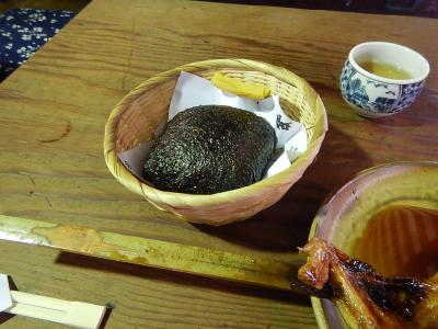 注文書を書いて窓口へ渡し店内へ。いろりで焼かれている鶏肉に目を引かれる。