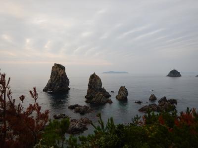 海上アルプスは青海島の周辺海域に点在する奇岩群で、様々な名前が付いている。観光船で見る方がより迫力があるとされているが、その日はもう終わってしまっていたので、陸から自然研究路を通って見ることにした。