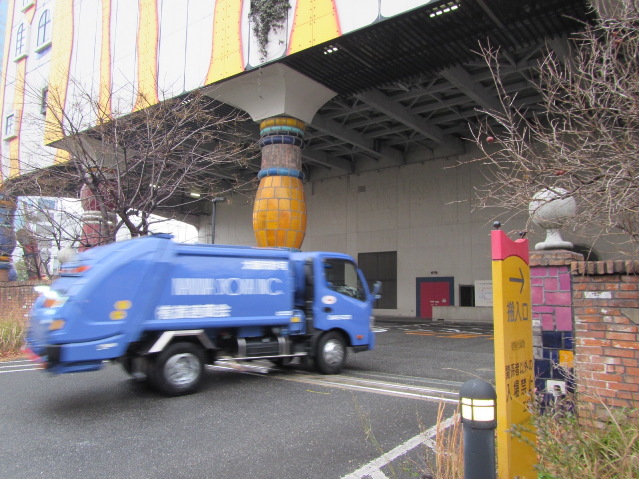 バスからすでに見えている異様な外観の建物は大阪市環境局舞洲工場、つまりゴミ収集車の出入りする清掃工場。