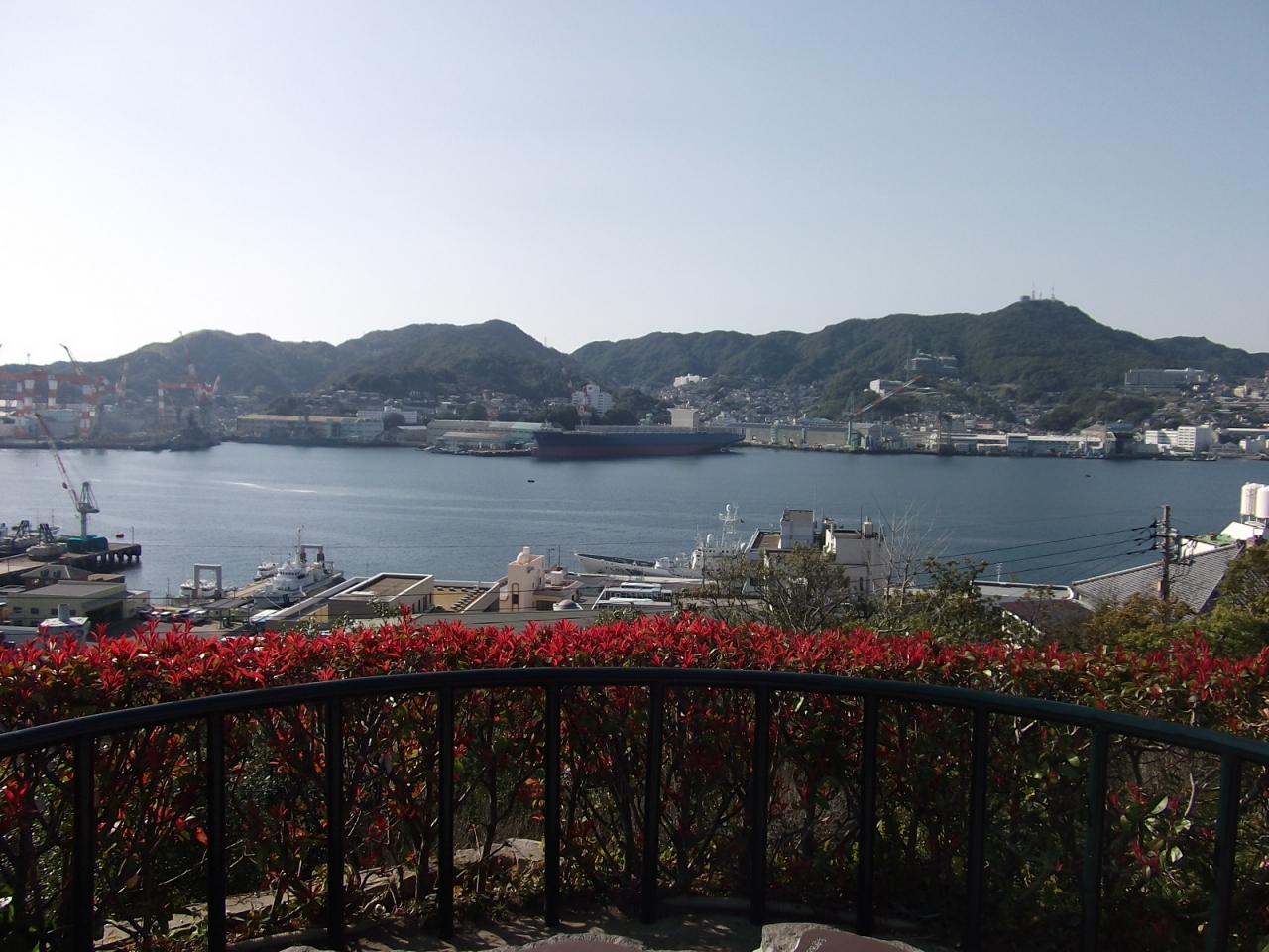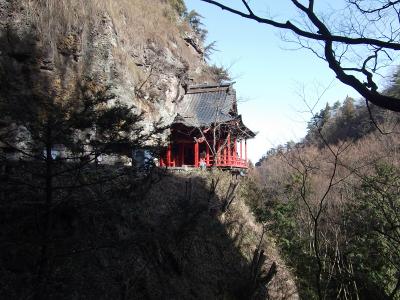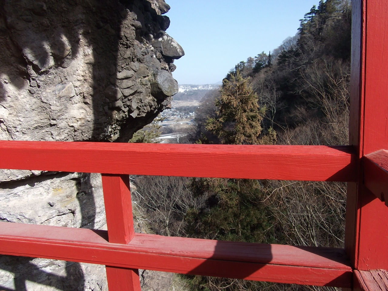 本堂のある広場から振り返ると山の中腹に朱塗りの観音堂が映える。観音堂の床板から少し下が透けて見えるのは高所恐怖症の人にはきついが、ここからの眺望はとても素晴らしい。