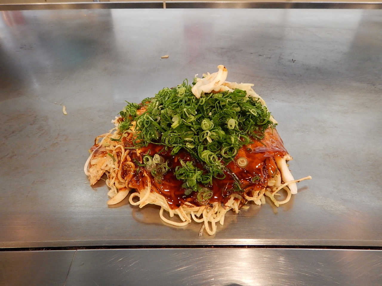 DXスペシャルお好み焼きを注文。大量のキャベツが使われていて、それがぎっしりと押しつけられて詰まっている。