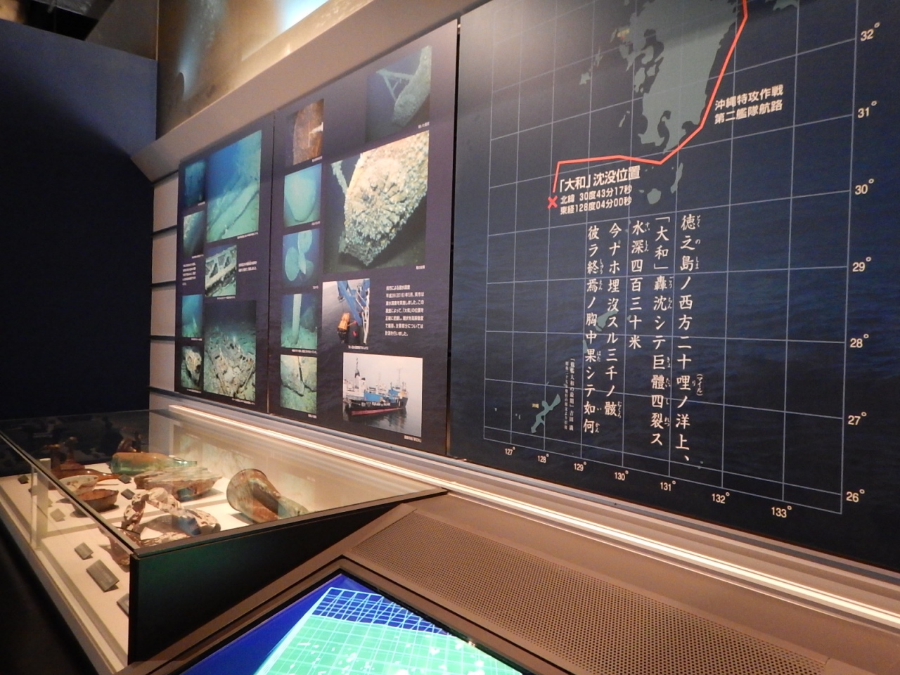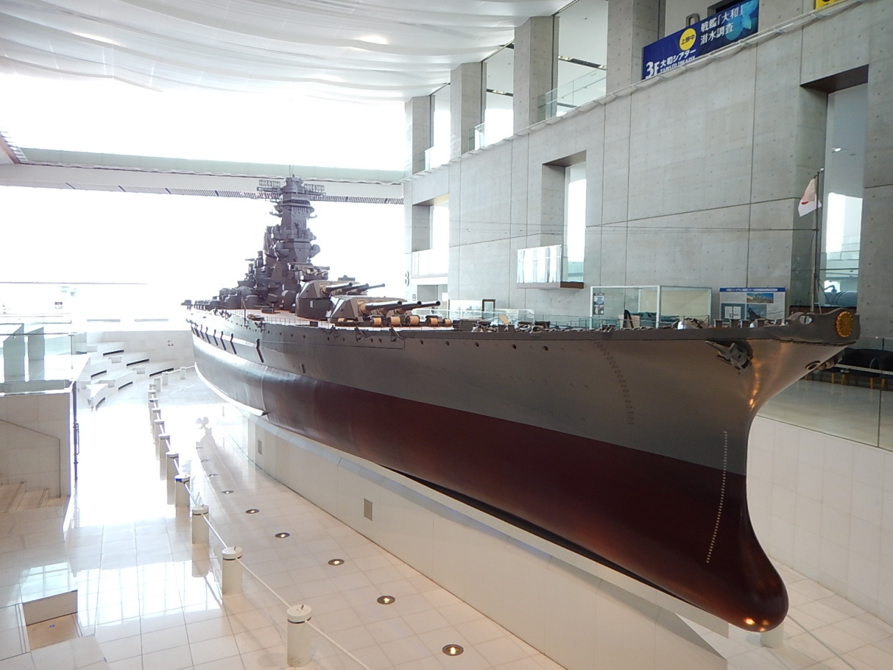 完成後、すでに大型戦艦から航空機などへ戦争がシフトしていったことにより、大和はアシスト的な役割でしか活躍の場がなかったことを学んだ。現在は沈没した大和の残留品の調査が進められており、引き上げられた品々もいくつか展示されている。- 旅行時期