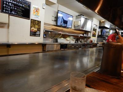 カウンターの長~い鉄板が目を惹き、ピカピカに磨かれている。