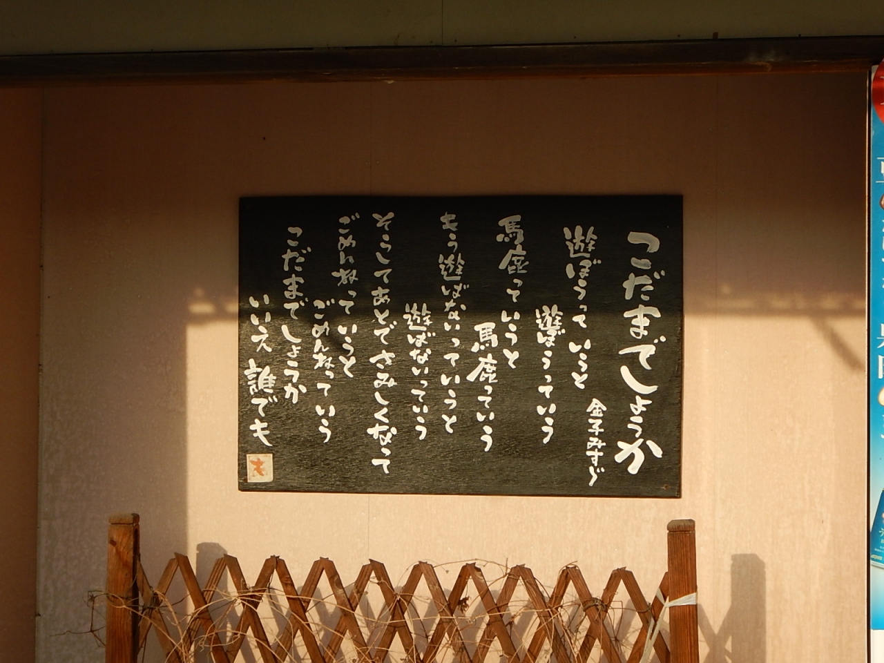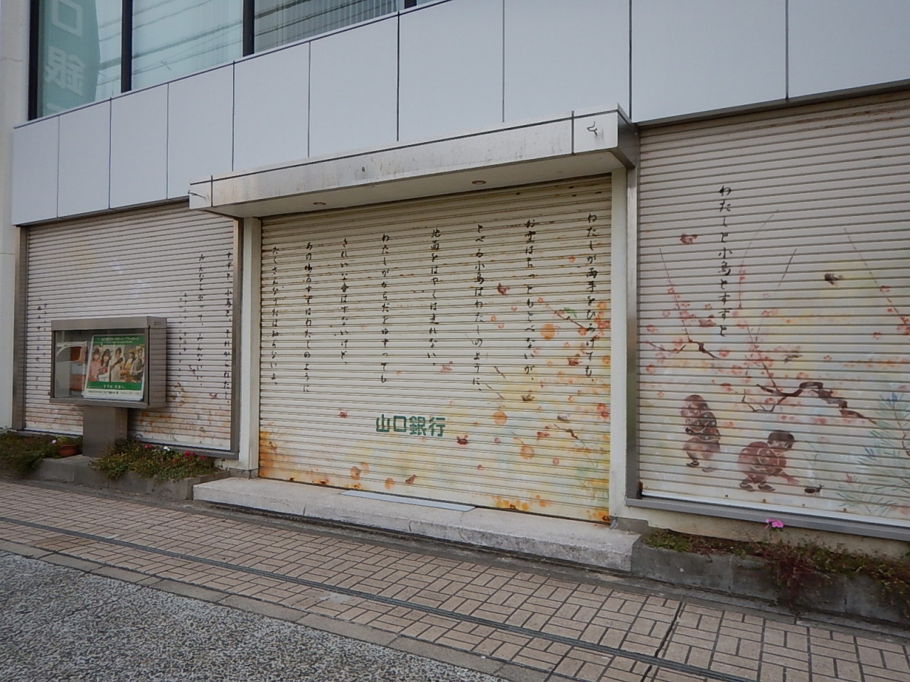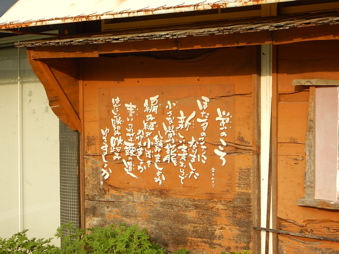 仙崎駅から記念館まで続く商店街。シャッターや軒先に金子みすゞの詩がかかげられている。店舗だけでなく一般の家も小さな板に詩を書いて出しているのが面白い。