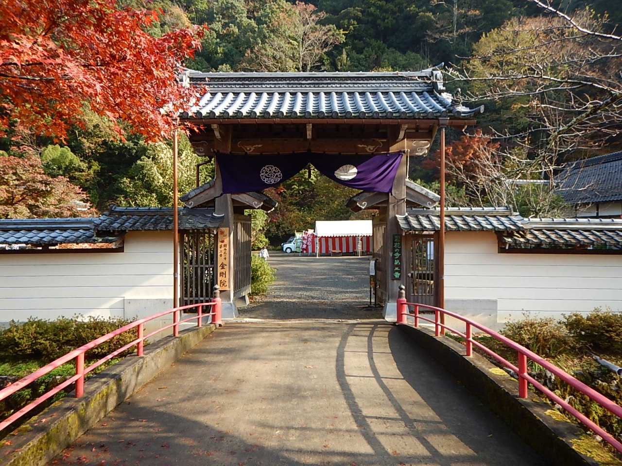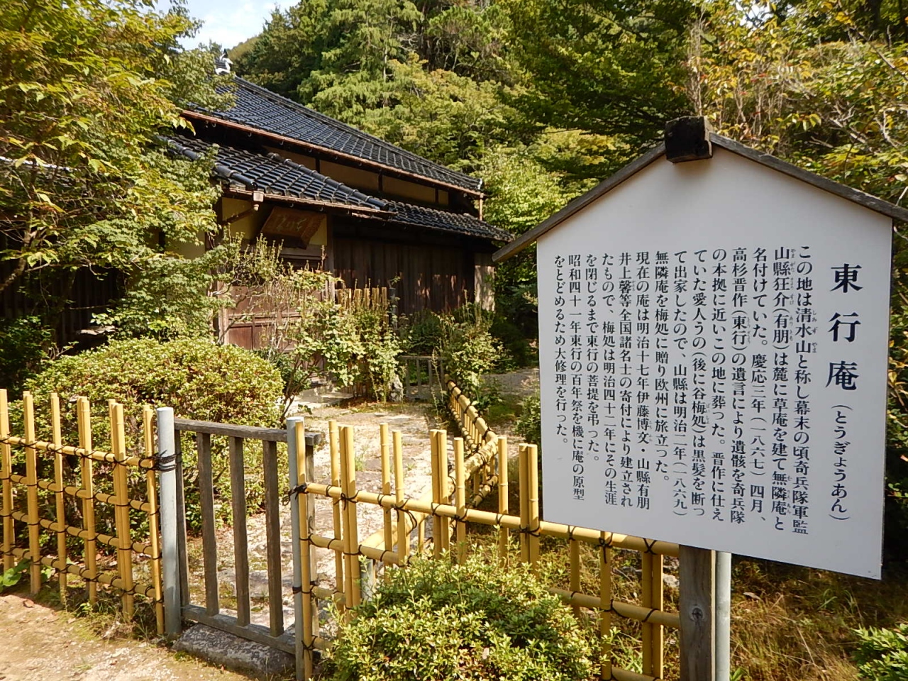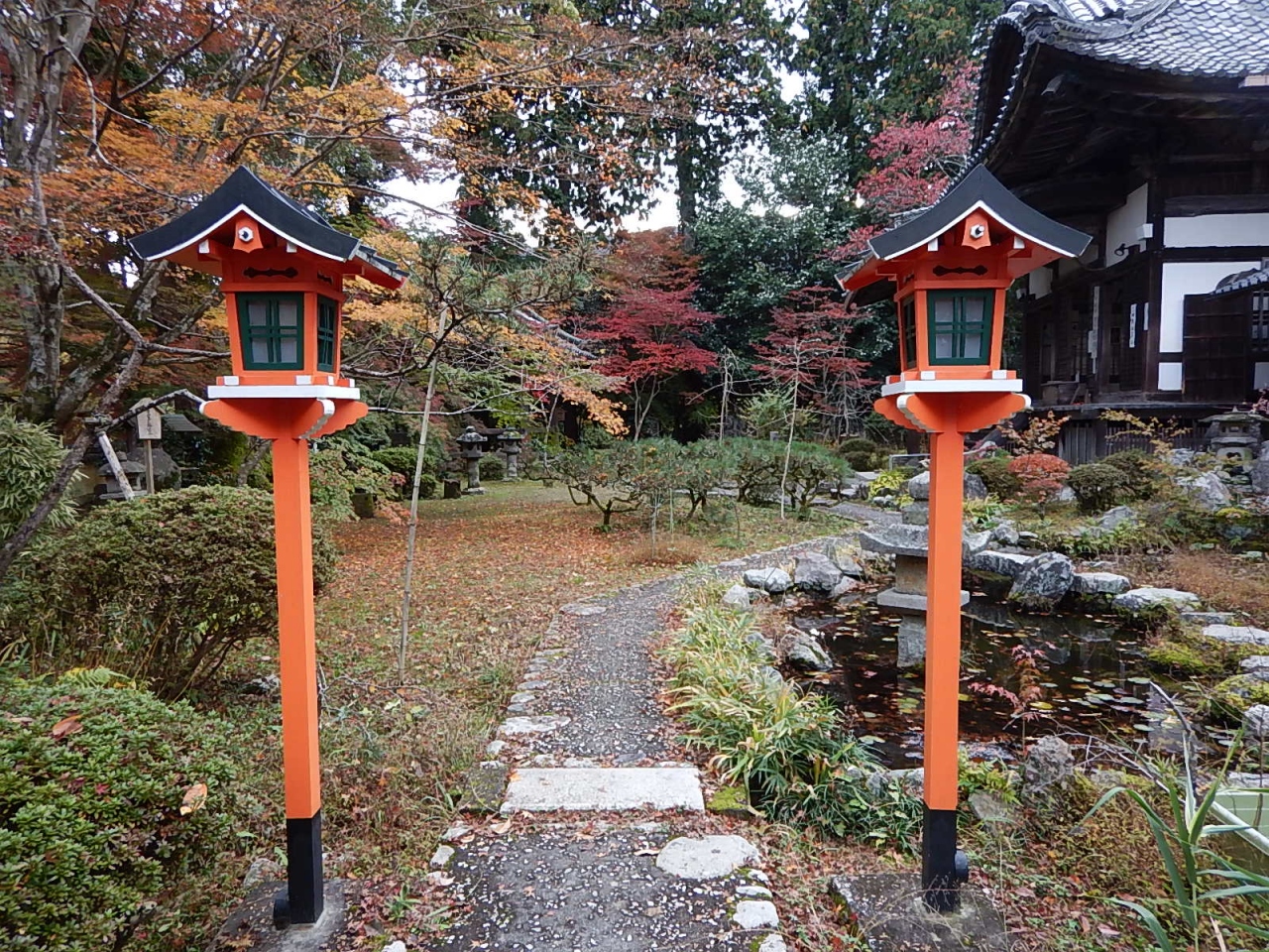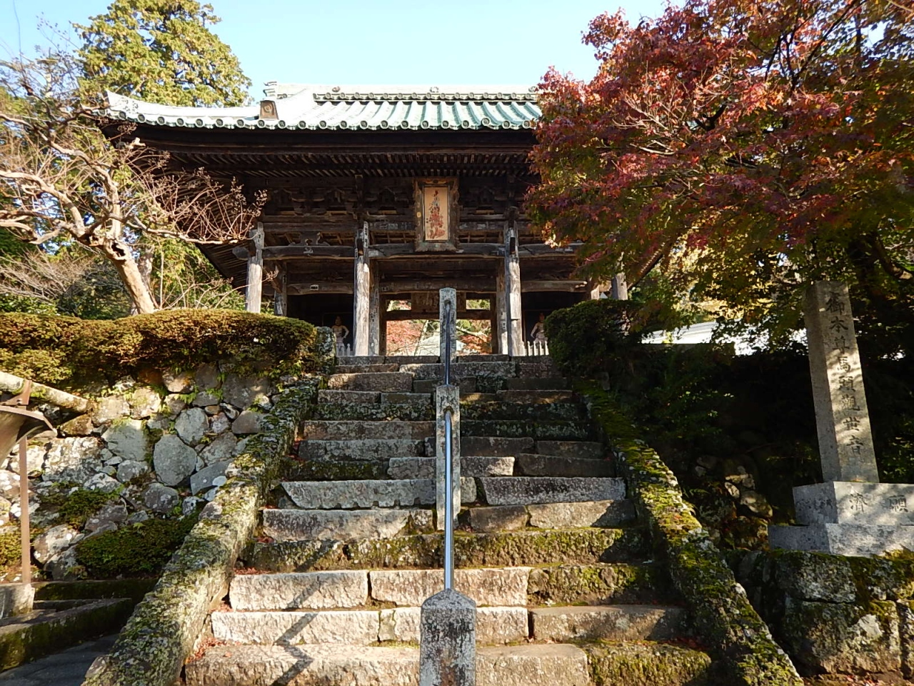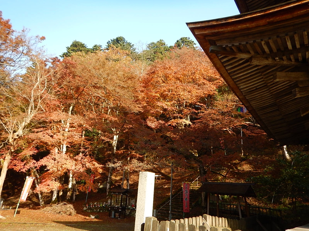 拝観受付をおこなって(御朱印帳をここであずける)、まずは境内を散策。例年より早く紅葉が始まっており、色とりどりの葉は見事。高台には在原業平の墓があったが、案外こじんまりとしていた。続いて堂内を見学。少し注意書きの張り紙が多かったような気もするが、寝て見ると見え方が異なるように傾斜をつけて作られた中庭などは面白い。