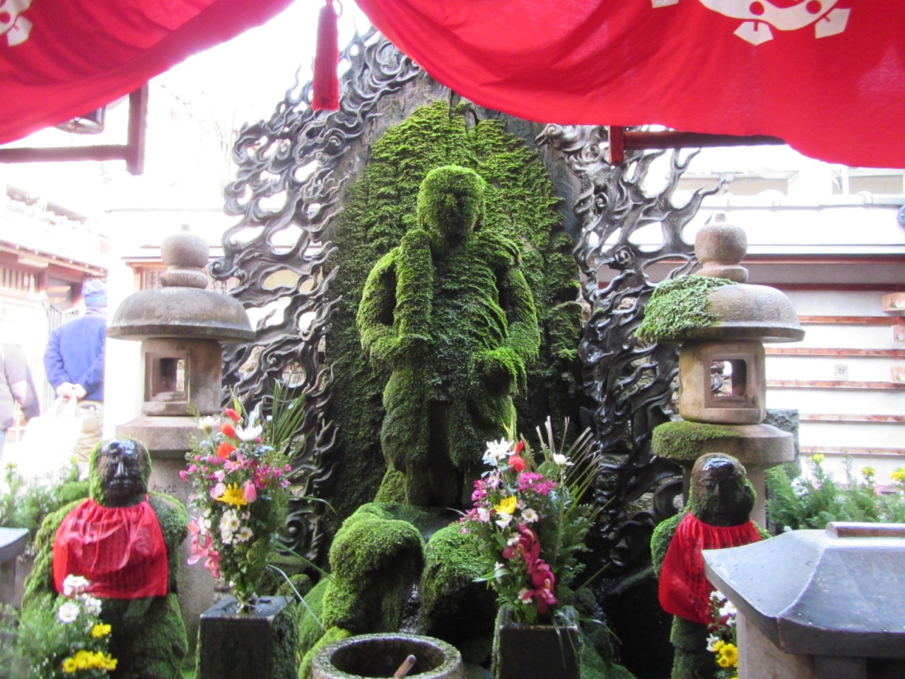 参拝者の水掛けですっかり苔むした不動明王像には道頓堀に来たのならぜひお参りしていきたい。