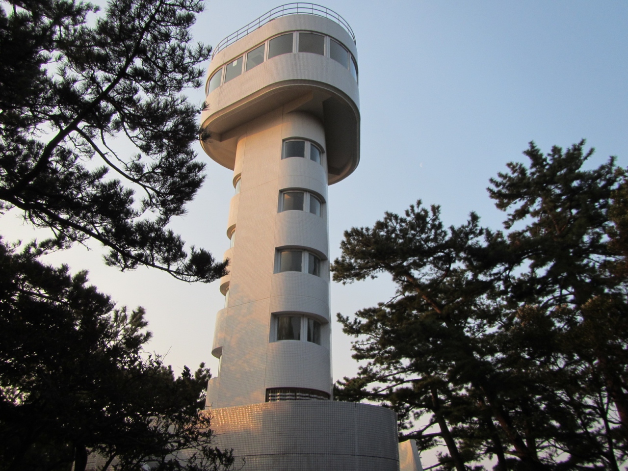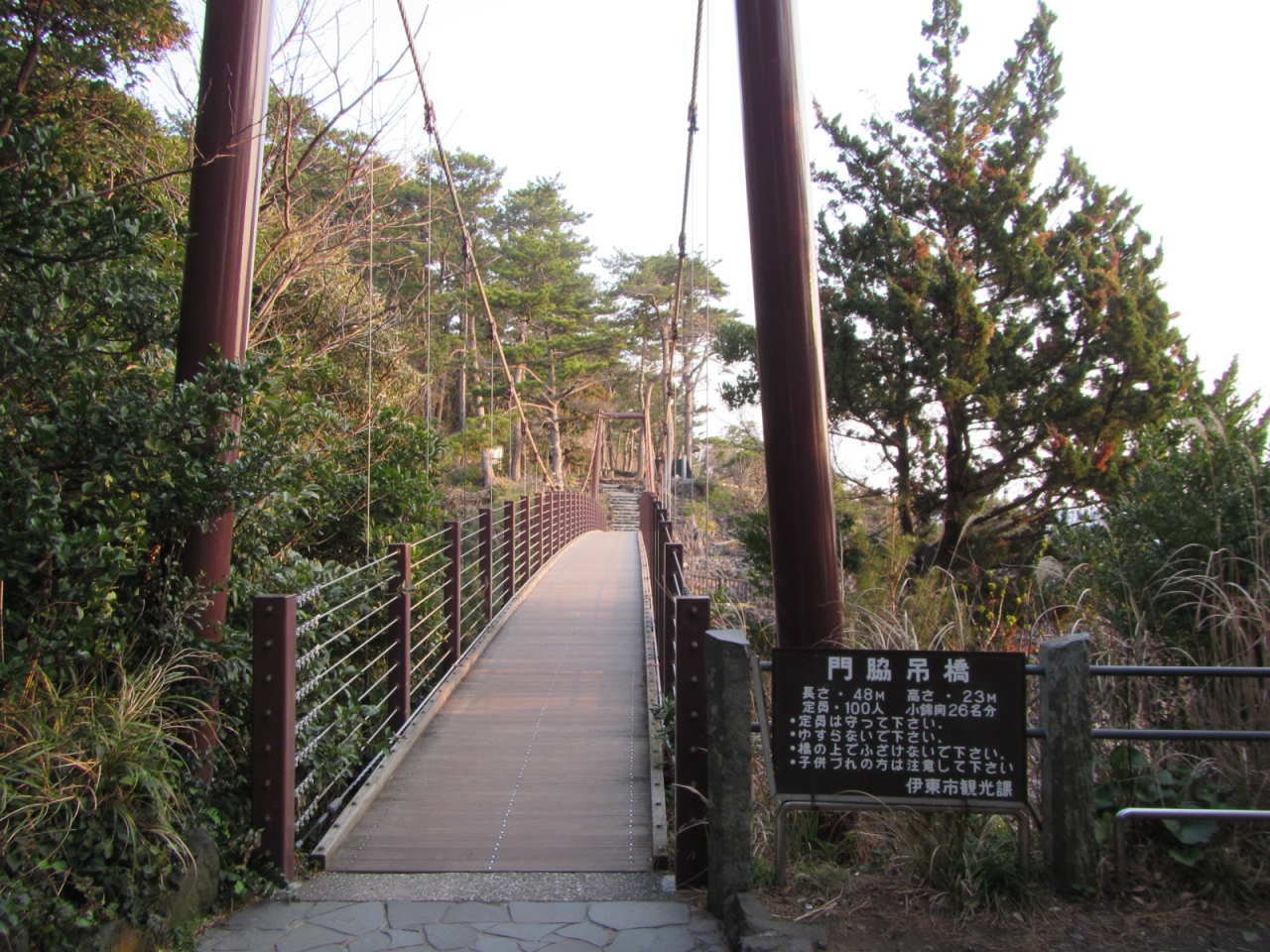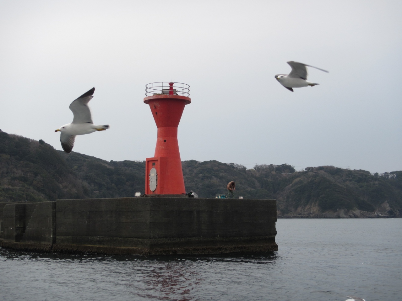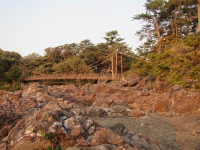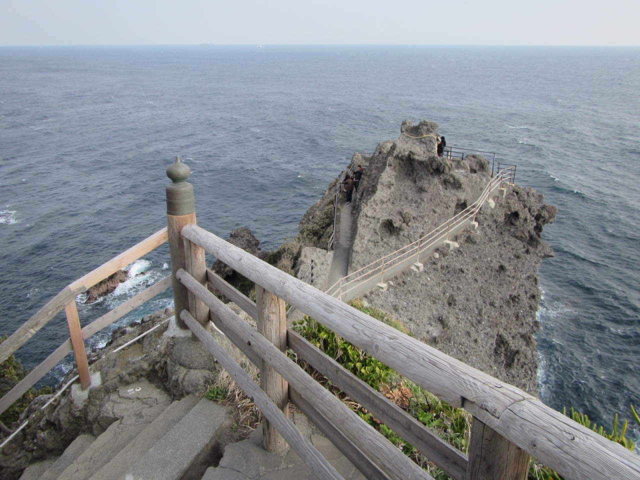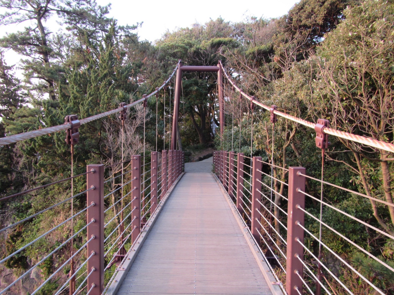 吊橋を渡って行くと灯台が現れる。この門脇灯台は上の部分がいびつな形をした変わった構造。
