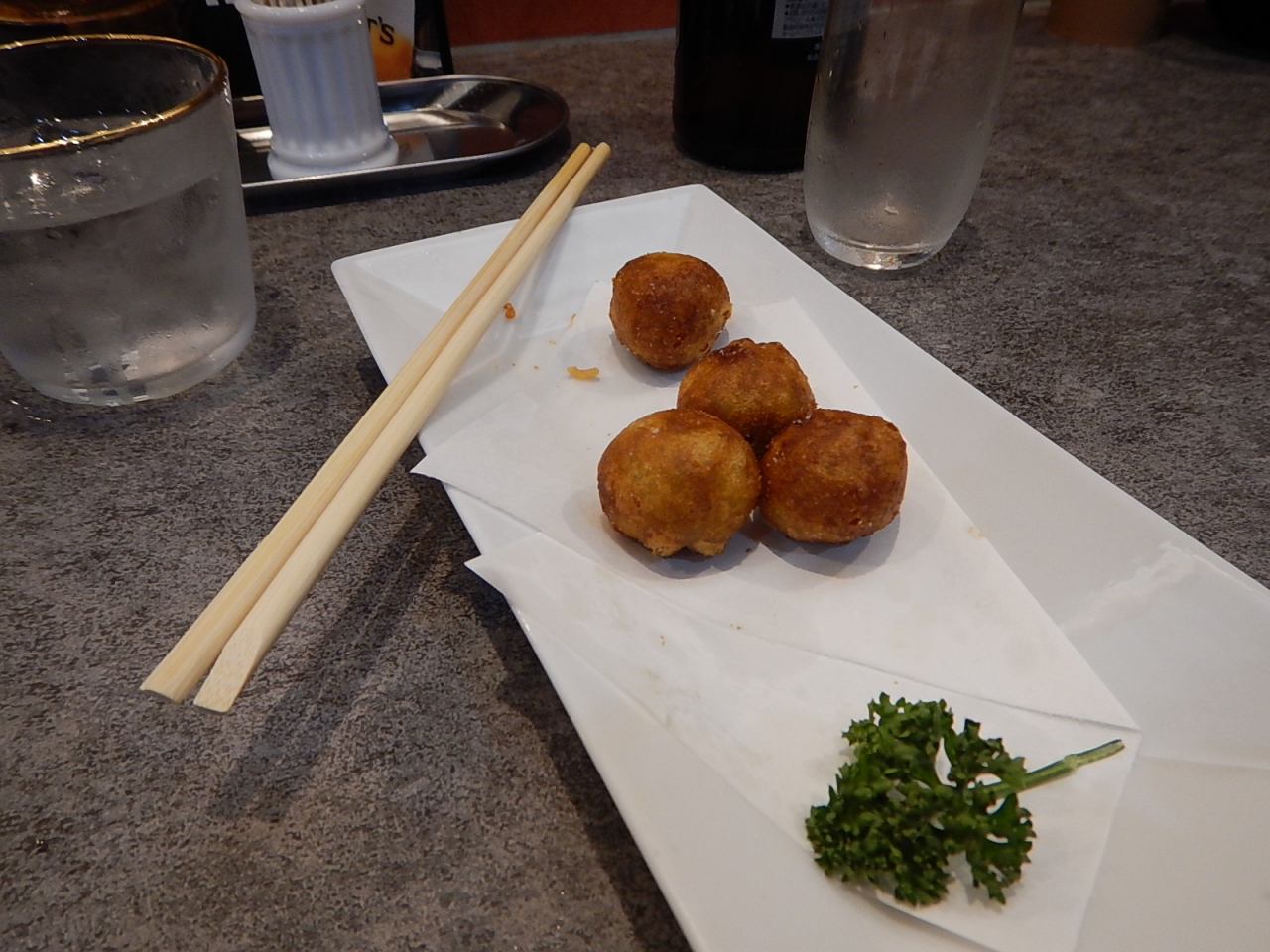辛子蓮根は珍しくボール状になって揚がっていた。蓮根はすり身になっていて、辛子は弱め。馬刺はその日は上の盛り合わせがあり、結構な量があって美味しかった。もちろん焼酎の品ぞろえも充分。