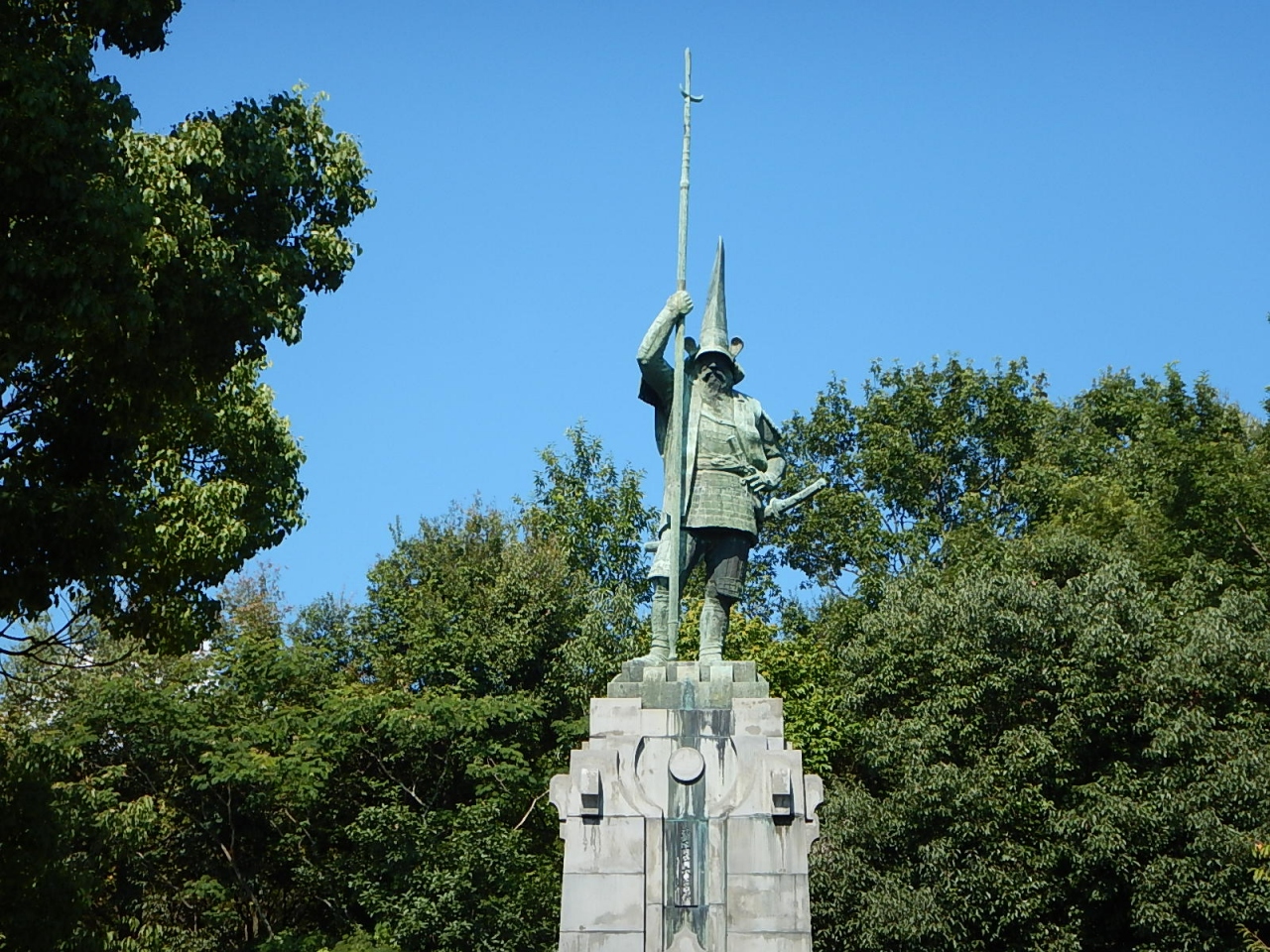 長階段の上にある加藤清正像は幸い影響を受けることなく、熊本の町を見守っている。