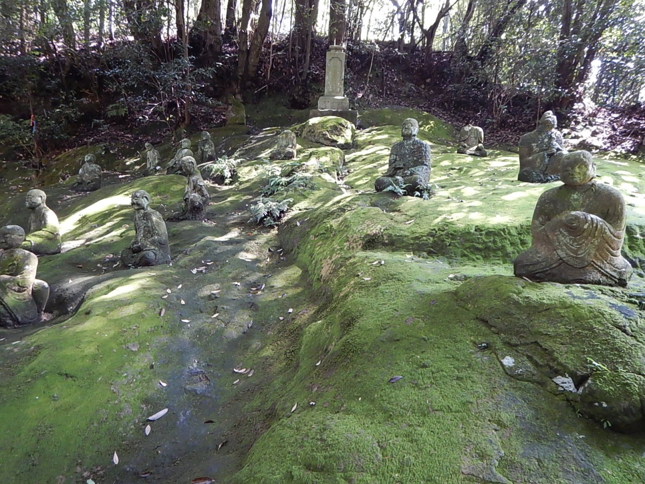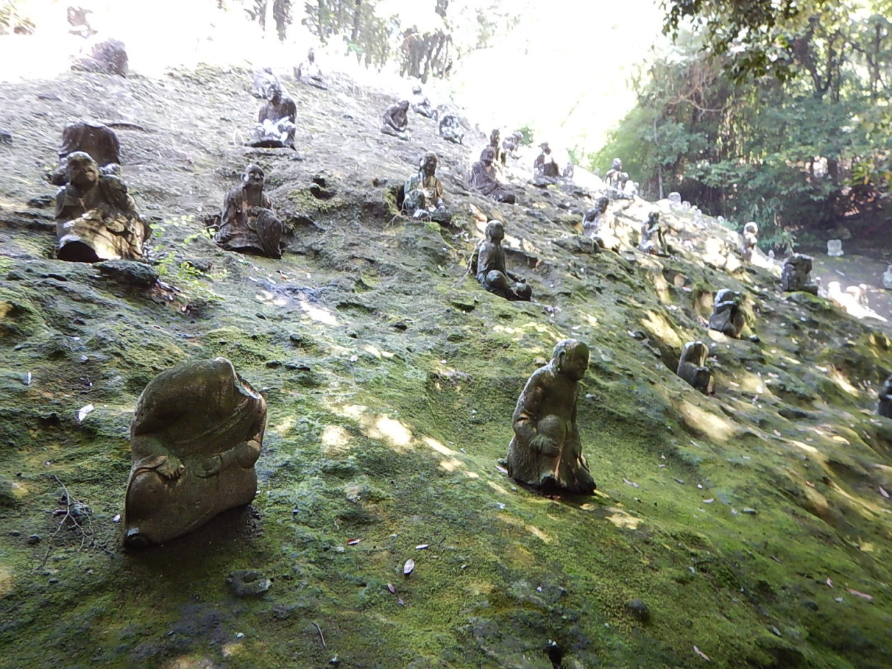 拝観受付(御朱印はここで預ける)から進むと日影になって苔むした階段の少し足場の悪い道が続き、その先に五百羅漢が岩肌に点在する。やはり苔むして風化し、損壊しているものもある。