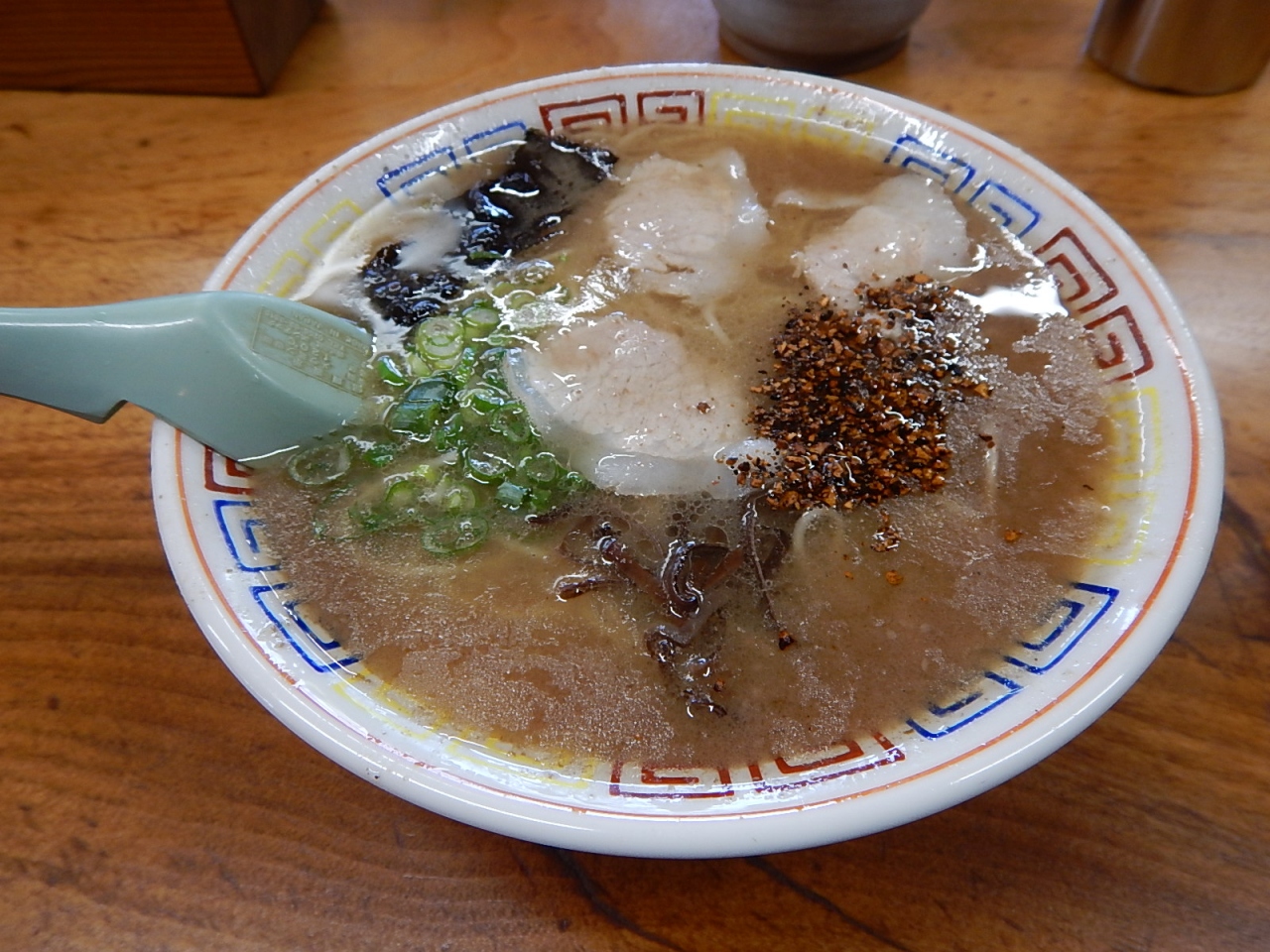 メニューはシンプルでラーメンは普通と大のみ。スープは豚骨系で店外まで独特の臭いが漂う。運ばれてくるとニンニクチップを乗せるかどうか聞かれる。あげてあるのでニンニク臭はほとんどない。スープは思ったよりもとろみが少なくあっさりしている。麺は細麺。油が浮いているおかげでスープが冷めることなく最後まで食べられる。