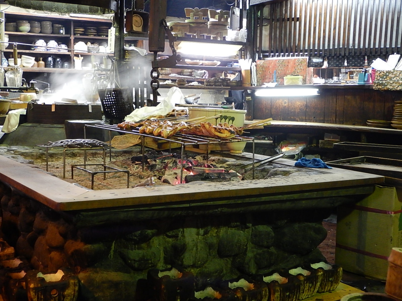 注文書を書いて窓口へ渡し店内へ。いろりで焼かれている鶏肉に目を引かれる。