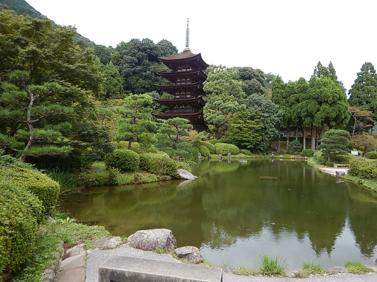 広大な境内の寺院で、五重塔は日本三大五重塔の一つであり、国宝指定。屋根が桧皮ぶきになっているのも特徴。池越しに見る五重塔は写真映えもいい。
