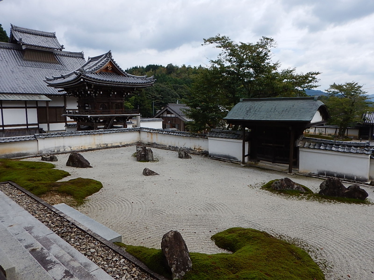 本堂の表からはきれいに波模様がつけられた石庭を鑑賞。裏からは緑と石の組み合わさった広い庭を鑑賞する。