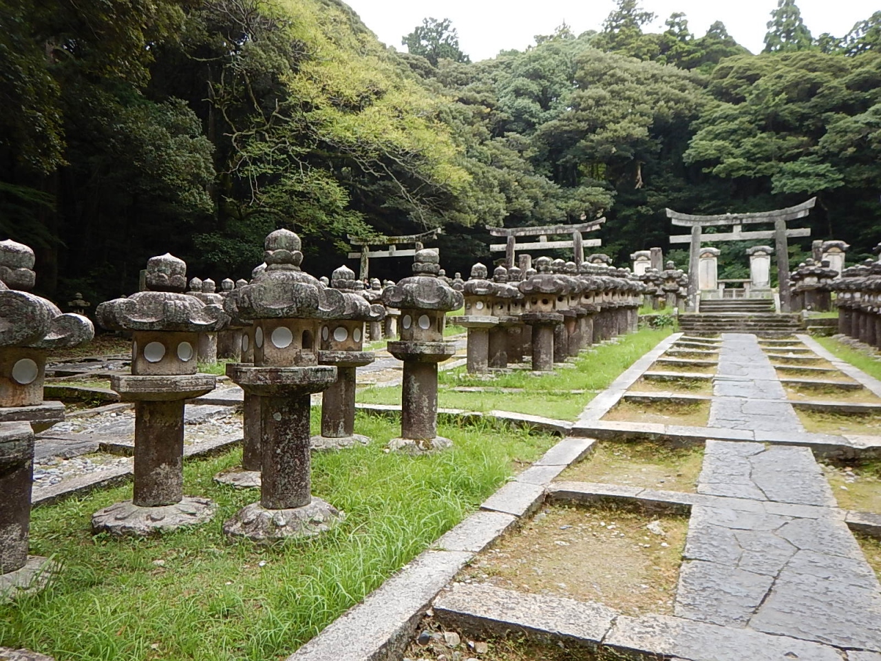 境内までは緩やかな階段の胸突坂が続く。震災の影響で中央の石灯籠群の大半が崩れてしまっている。御廟の前の石灯籠も損壊しており、ここはかなりの影響があったようだ。