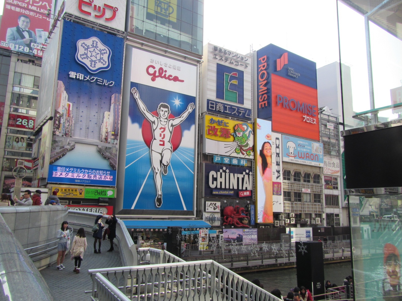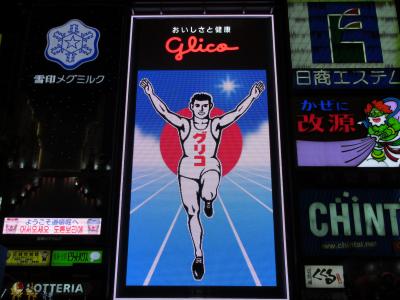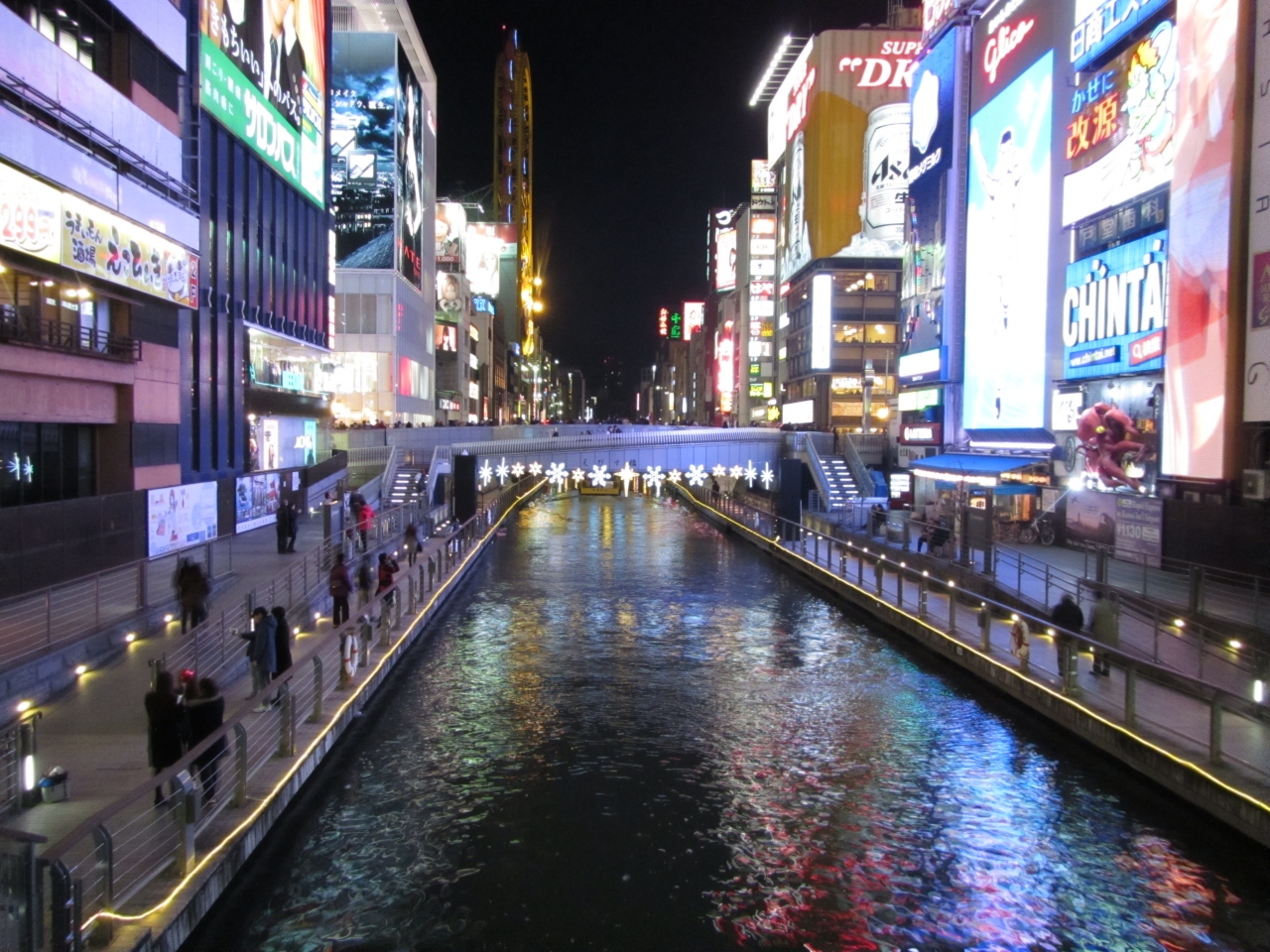 大阪の象徴道頓堀。散策するなら夜がいい。派手な巨大看板やたこ焼き、お好み焼きといった大阪グルメに観光客が賑わう。