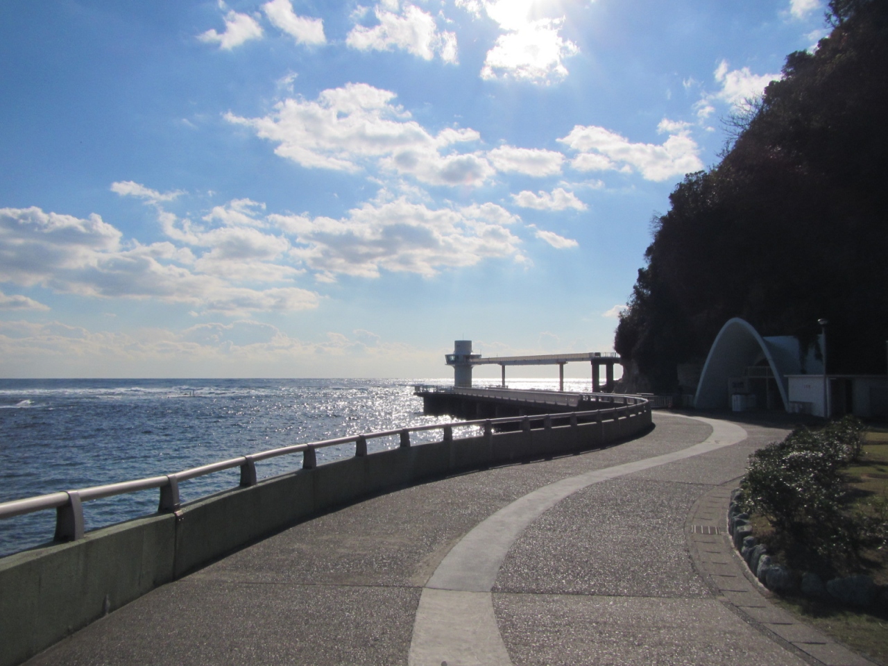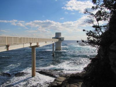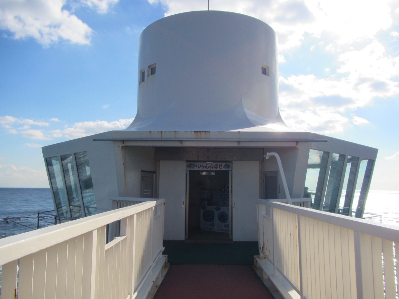 駐車場は少し歩いたところにある水族館の有料駐車場を利用する。チケットを購入し、トンネルを通って歩いて行くと、海の上を歩く通路の先に展望塔がある。太平洋の網はかなり荒く、風も強いので注意が必要。