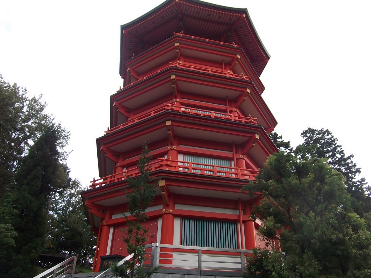 龍の欄干の階段を昇っていくと、朱塗りの五重塔が鎮座し、ここから金乗院一体を見下ろせる。