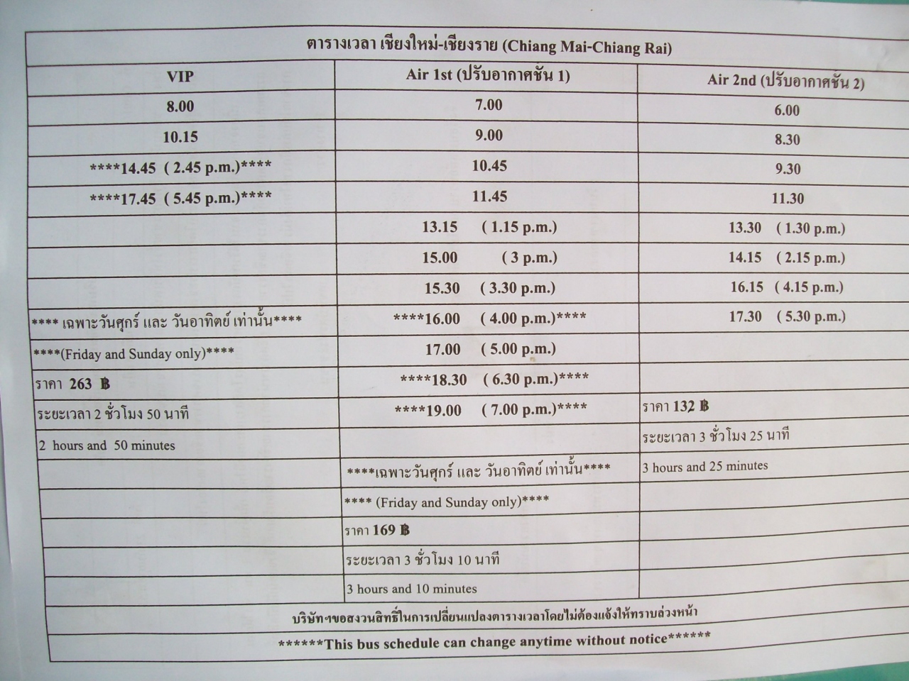 チェンマイ発チェンラーイ行きバス時刻表(2010年11月現在)