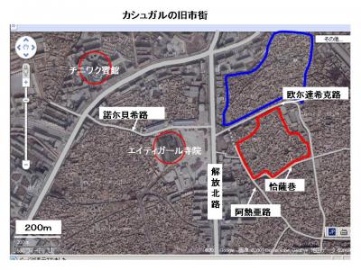 当局は欧尓達希克路の北側を「喀什葛尓老城景区」として保存、観光用にしています。*茶色の線で囲った地区です。(葛はクチ片に葛)