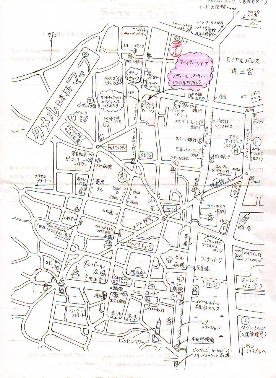 ←アティティ・ツアーでもらった地図です。無茶力作です。誰が書いたんだろう? タメル歩きには必携です。 元画像を印刷いただくとよく見えます。- 旅行時期