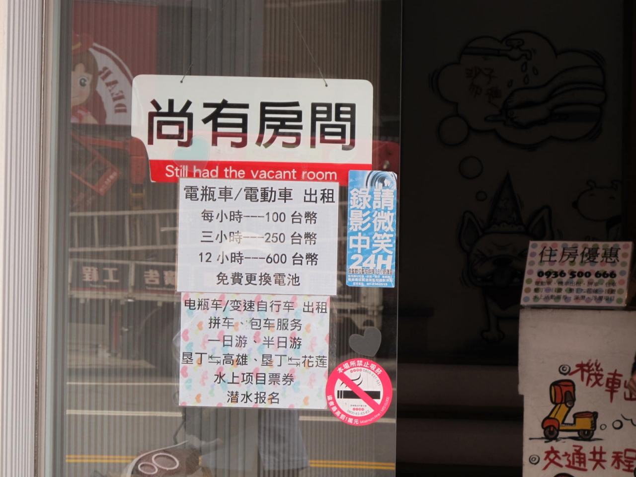と、墾丁街道を歩いていると小さなホテルで、3Hで250元の張り紙を見つけた。