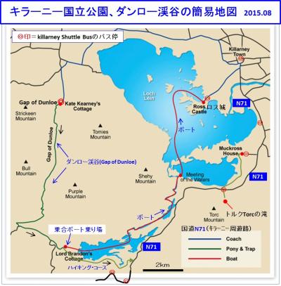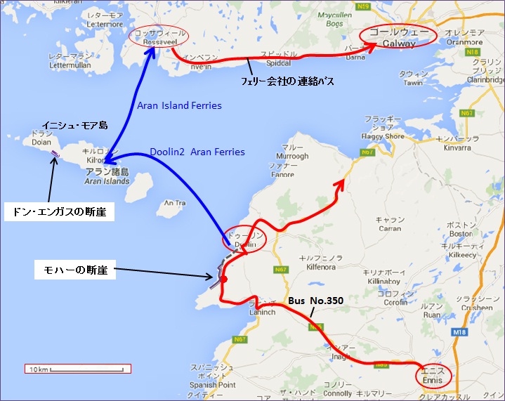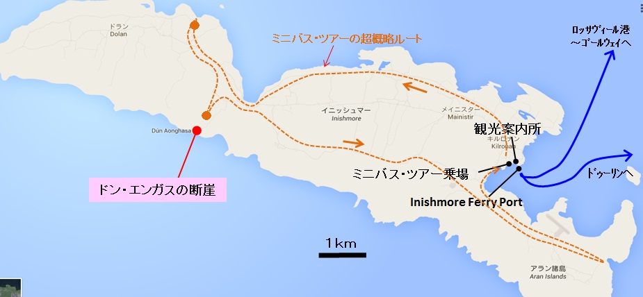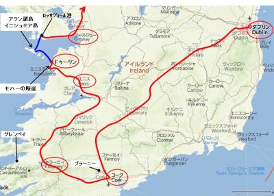 ジャイアンツ・コーズウェイ、ロープブリッジ(キャリック・ア・リード吊り橋)、ダークヘッジの位置を書き込んでみました。