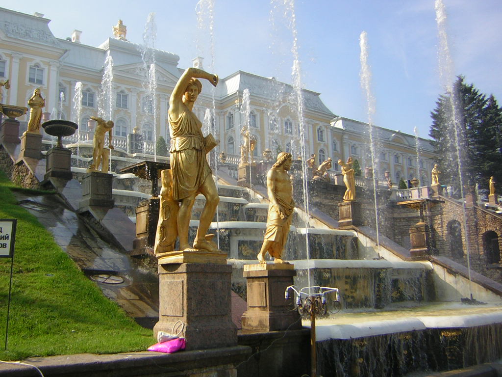 ペテルゴーフのもう一つの見所「宮殿前階段の噴水」は、正午12時丁度に一斉に放出されます。のでそれまでは“階段の噴水”は出ていません。*それでも綺麗な場所ですが。