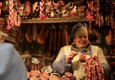クリスマスマーケットにてハムを売っていたお姉さん。まさかのピアスもハム...