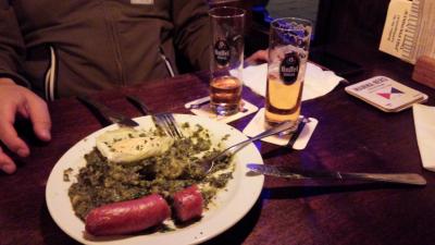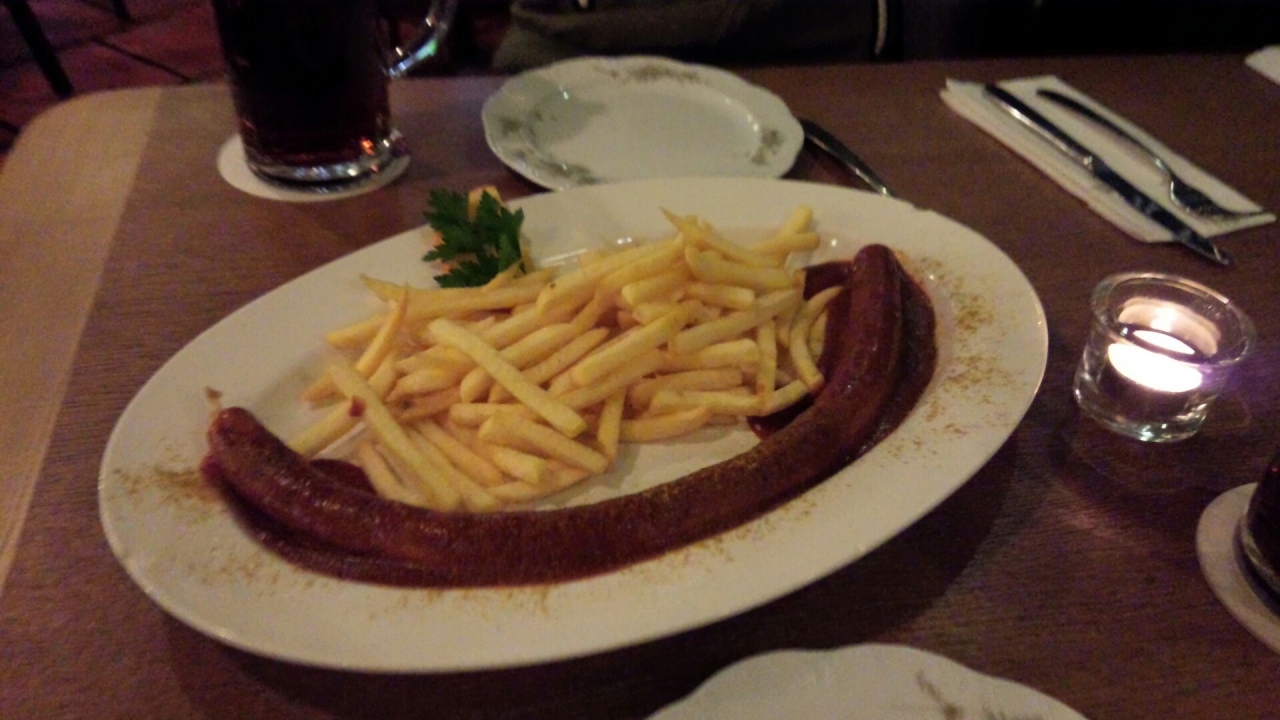 初めてのアルトビール2~3杯飲み、カリーブリュストをオーダーしましたが2人で20ユーロちょっと。