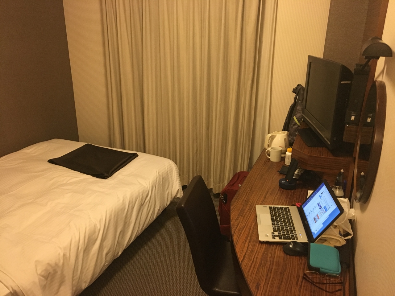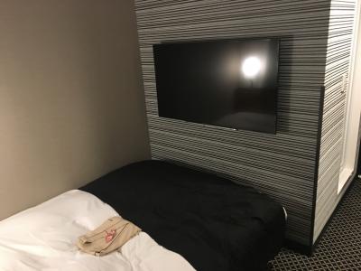 部屋は予想通り少々狭いですが、東京のビジネスホテルはまあこんなものかなと思います。部屋の内装はかなり新しく感じ、とても綺麗でした。部屋の広さの割にテレビ画面が50インチくらいあってかなりでかいです。