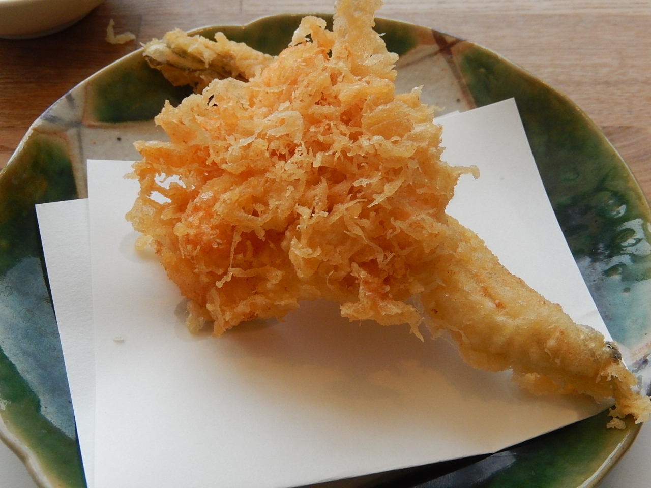 - 新鮮な白身魚、海老、アナゴ、季節の野菜のてんぷらが食べられる。