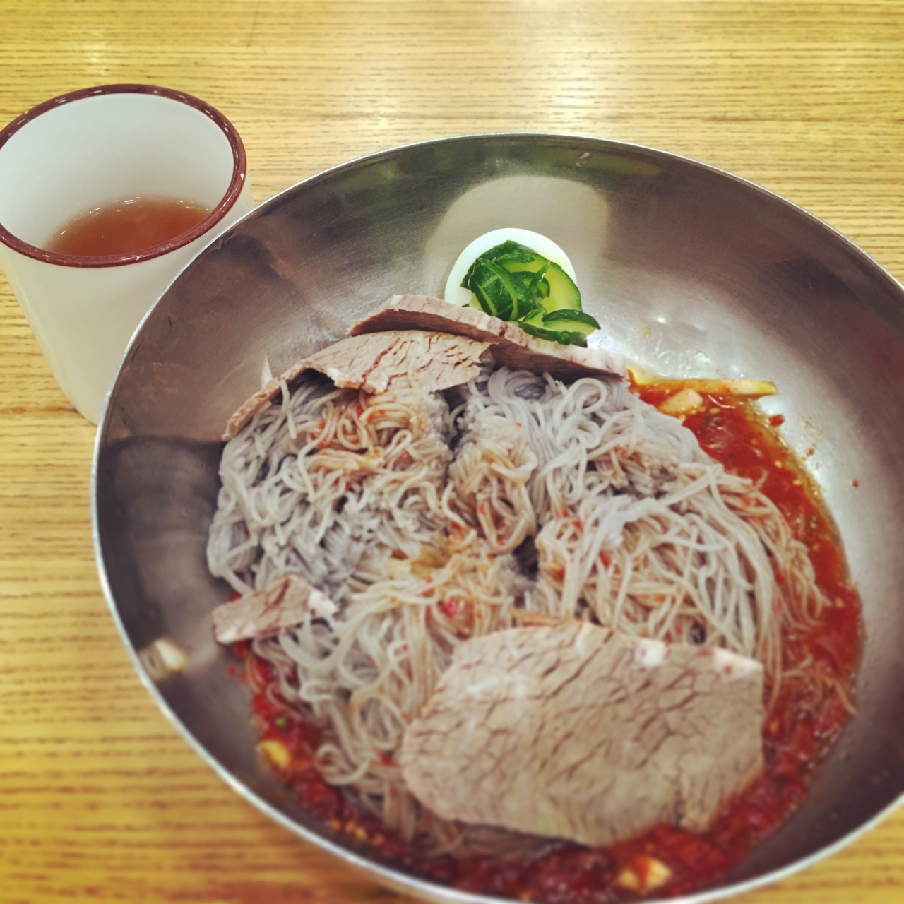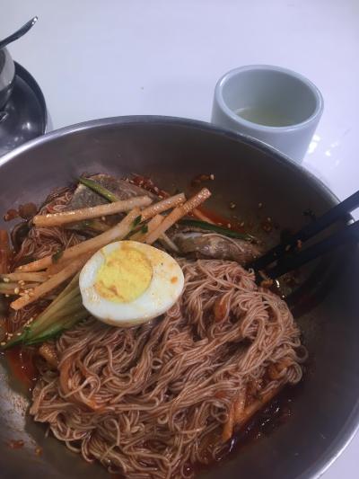 ビビン冷麺は麺が黒っぽく、赤いタレはやや甘めで美味しくいただけます。