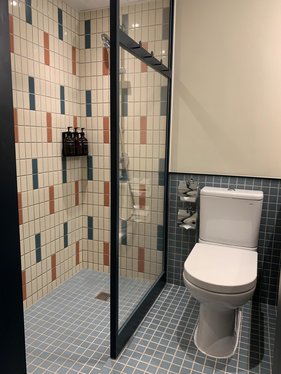 アメニティは使い捨ての小さい石鹸と、シャンプーは据え置きであります。シャワーは固定タイプ。ドライヤーはデポジットを入れてフロントで借りる形式でした。