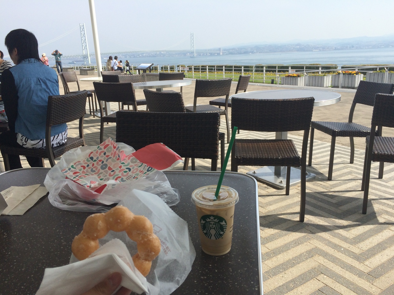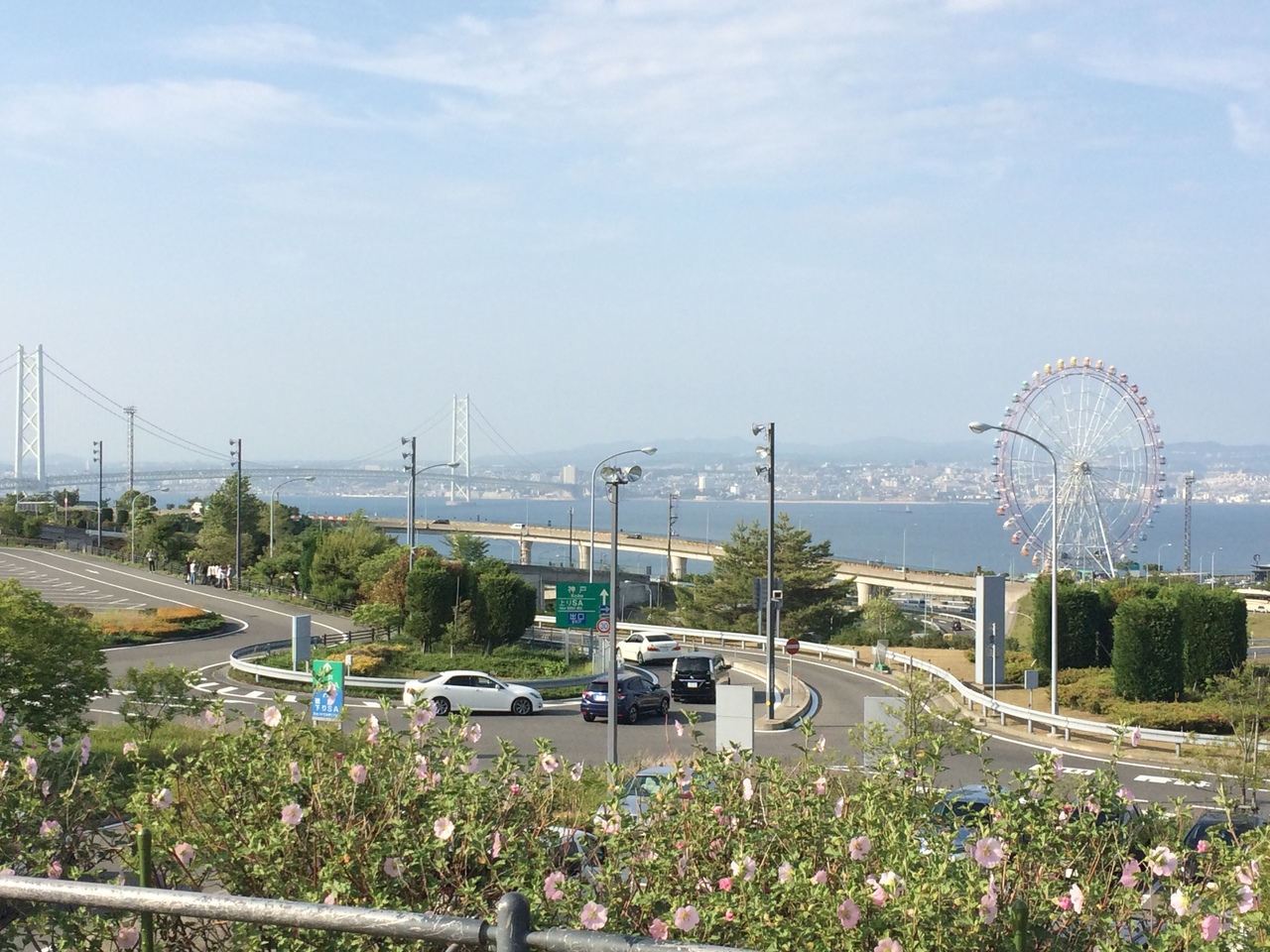 淡路島のSAからの撮影。観覧車と海と空と明石海峡大橋で、とても綺麗で絶景ですね。夜は大橋がライトアップされ、イルミネーションが色とりどり変わり、迫力があります。サイズも大きいので、これだけ離れていても大きさがわかりますね。