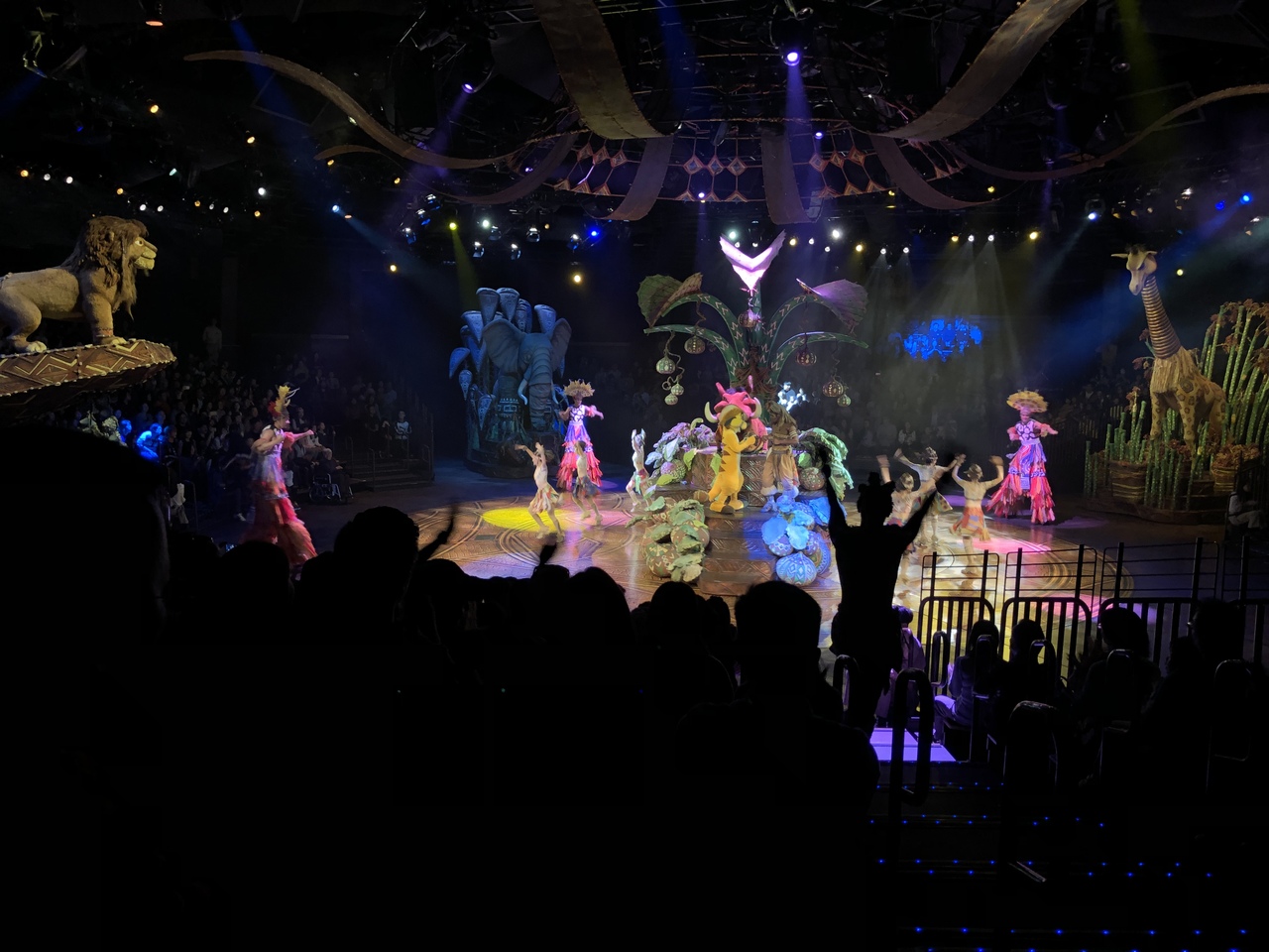 こちらのショーは本場で観るものと変わらず、1回30分と本格的でした。とても素晴らしい内容で、ディズニーランドの1つのアトラクションと思えないレベルでした。結構時間が長いく、円型のステージでトイレはステージの前を通らないと行けないので先に済ましておいた方がいいです。