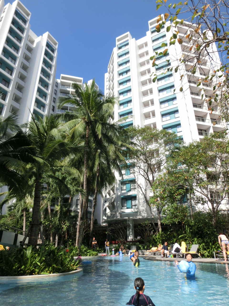 タワー5-6棟からなってます♪またタクシーはメーターで行くように警備員が事前にしっかり交渉してくれます♪近くにコンビニやマッサージ店もあり5分位歩けばイオン系スーパーマックスバリューもありこの辺一帯は飲食店もかたまってあります。また7分位歩けば(ホテルから送迎シャトルあり)大型ショッピングセンターもあるので不自由ありません!!