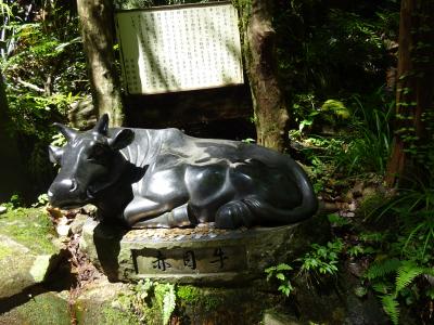 「霊蛇滝」を見ながら歩いていくと、道沿いに鎮座する「赤目牛」がいる。昔...