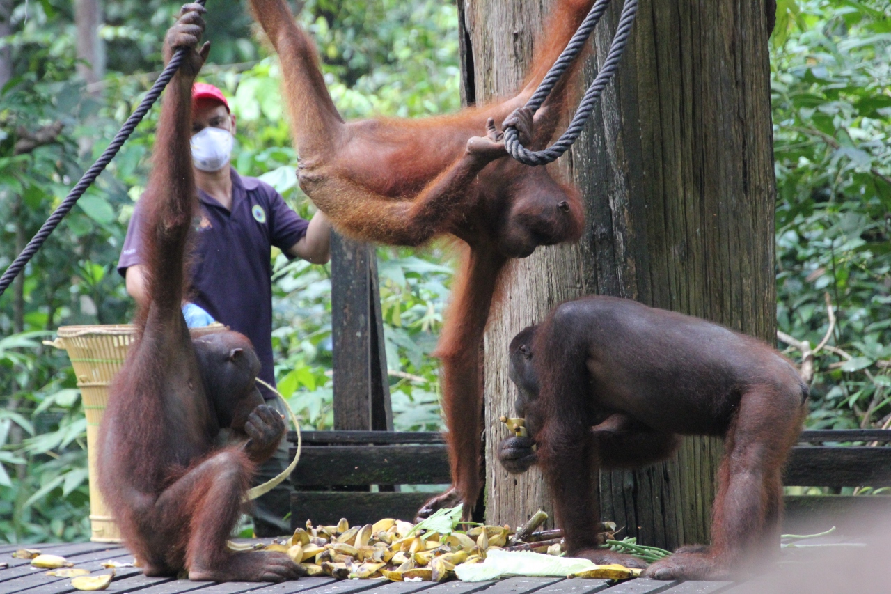 午前の部に行ったが、係員が給餌を始めると周囲のジャングルから木やロープをつたってオランウータンが給餌台に降りてくる。
