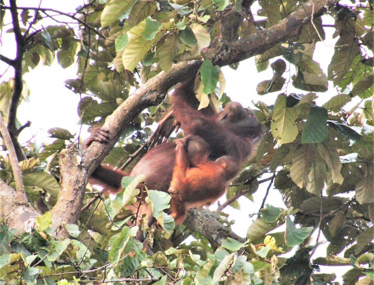 6頭のオランウータンが現れたが、ラッキーなことに赤子を抱いた野生のオランウータンファミリーにも出会える事ができた。