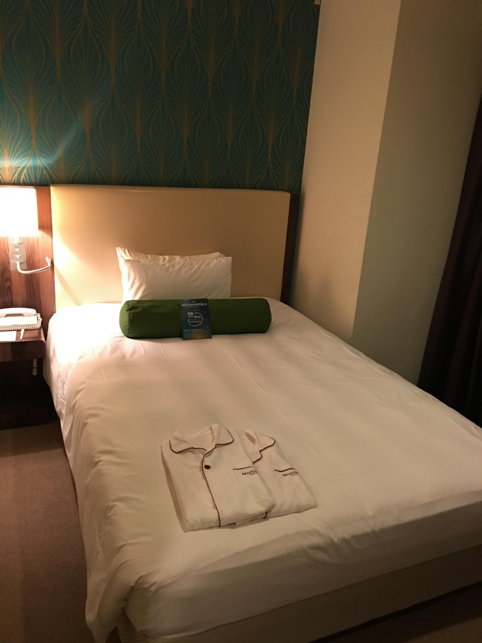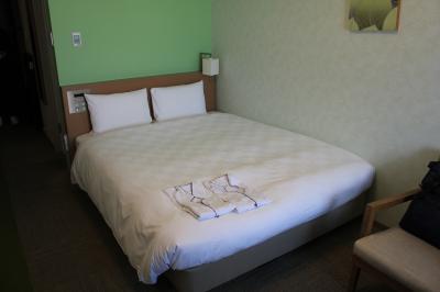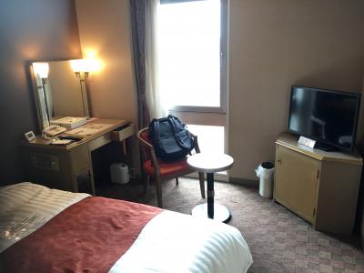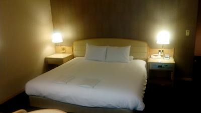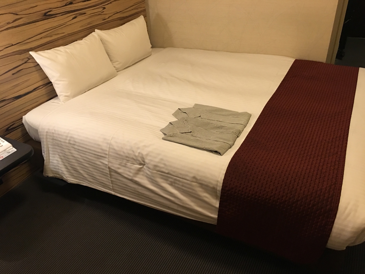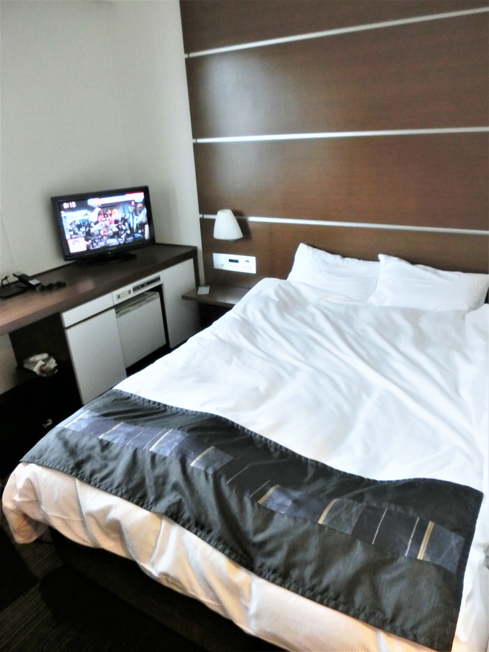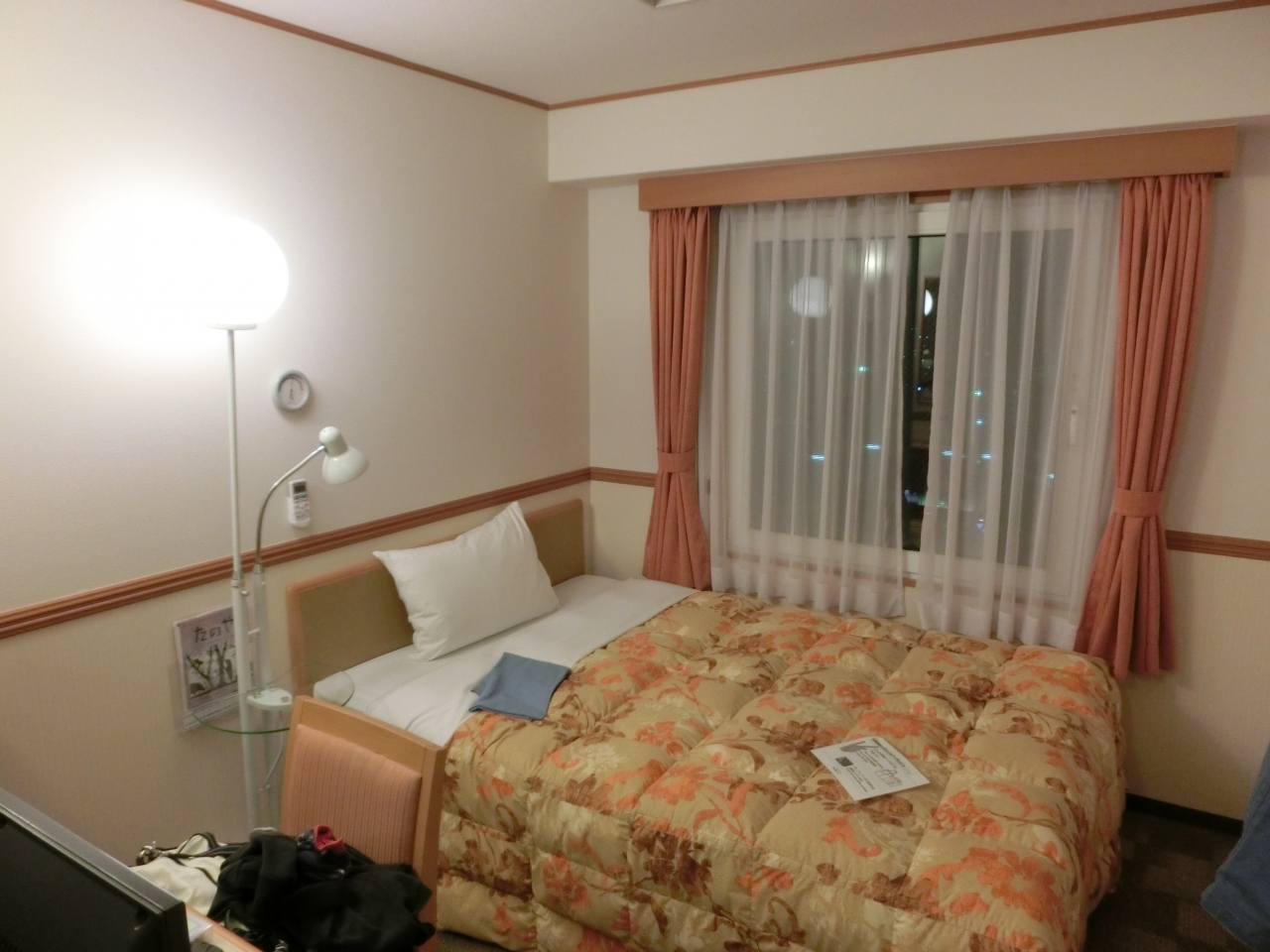 部屋は典型的ビジホ、セミダブルのベッドと狭い。