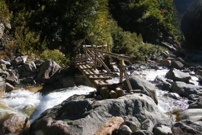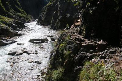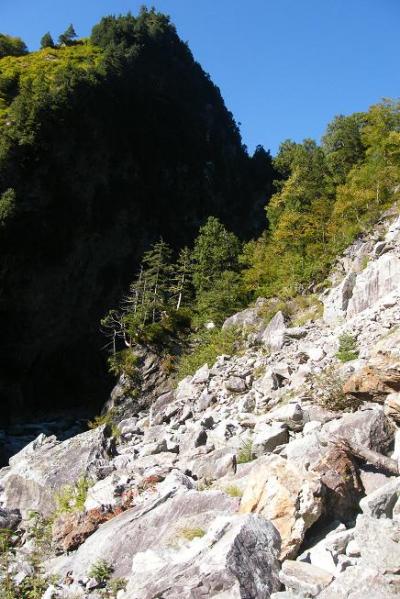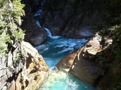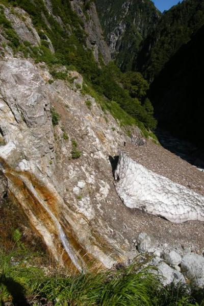 黒部渓谷(くろべけいこく)は、黒部第4ダムと黒部湖によって上流側の「上ノ廊下」と「下ノ廊下」に分断されましたが、その下流側「下ノ廊下」には登山道があります。これは元々は電力会社の巡視路で、毎年深い雪に覆われて桟道や梯子が傷むため、開通は毎年秋口です。秋から雪に閉ざされるまでの間だけ、安全に通れます。10月上旬に通りましたが、まだ雪渓が少し残っていました。登山道はほぼ水平に造られているのですが、場所によっては200mくらいの断崖の上に道があります。手すりは細い針金だけで、かなりスリルがあります。喩えれば、駅のホームの端(白線の外側)くらいの幅の道で、その端が200mくらいの高さのイメージです。道自体は歩きやすいですが、油断して躓いたりすると一巻の終わりになってしまいます。だけど、美しい渓谷美を堪能しながら歩く道は、とても魅力的です。