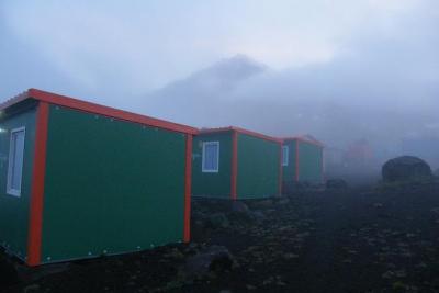 ロッジからは、天気がよければカリヤーク山とアバチャ山がよく見えていい眺めです。ロッジは4名1室の部屋が2個あり、出入口の共有部分に雨具を掛けたりできます。