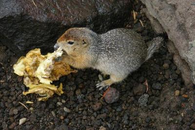 小屋の周りにはかわいいジリスがいます。人からえさをもらうからか、人をあまり怖がりません。誰かが落としたキャベツか何かを食べている写真をアップしました。本来はあまりえさをあげるのは良くないと思いますが…。