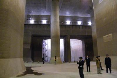 その一連の施設のうち、江戸川に貯まった雨水を江戸川に排出する庄和排水機場に隣接した資料展示館が「龍Q館」で、地下には巨大な貯水空間が構築されています。その地下施設の見学会が予約制で行われていて、これに団体で参加しました。