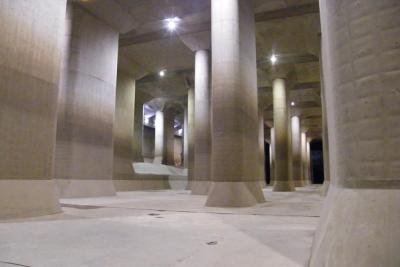 春日部付近の旧利根川沿いの低地は排水が悪く、大雨のたびに洪水に見舞われていたそうですが、それを解消するために一帯を流れる小河川で溢れた水を一旦巨大な地下空間に集め、それを高性能のポンプで汲み上げて江戸川に放水する施設です。