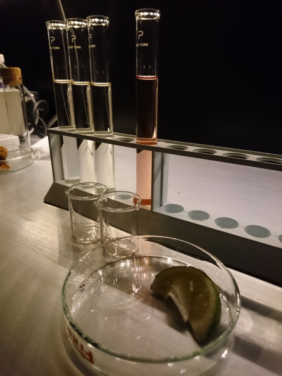 取り皿はシャーレ、箸はピンセット、ジョッキはビーカー!という、楽しいバーです。