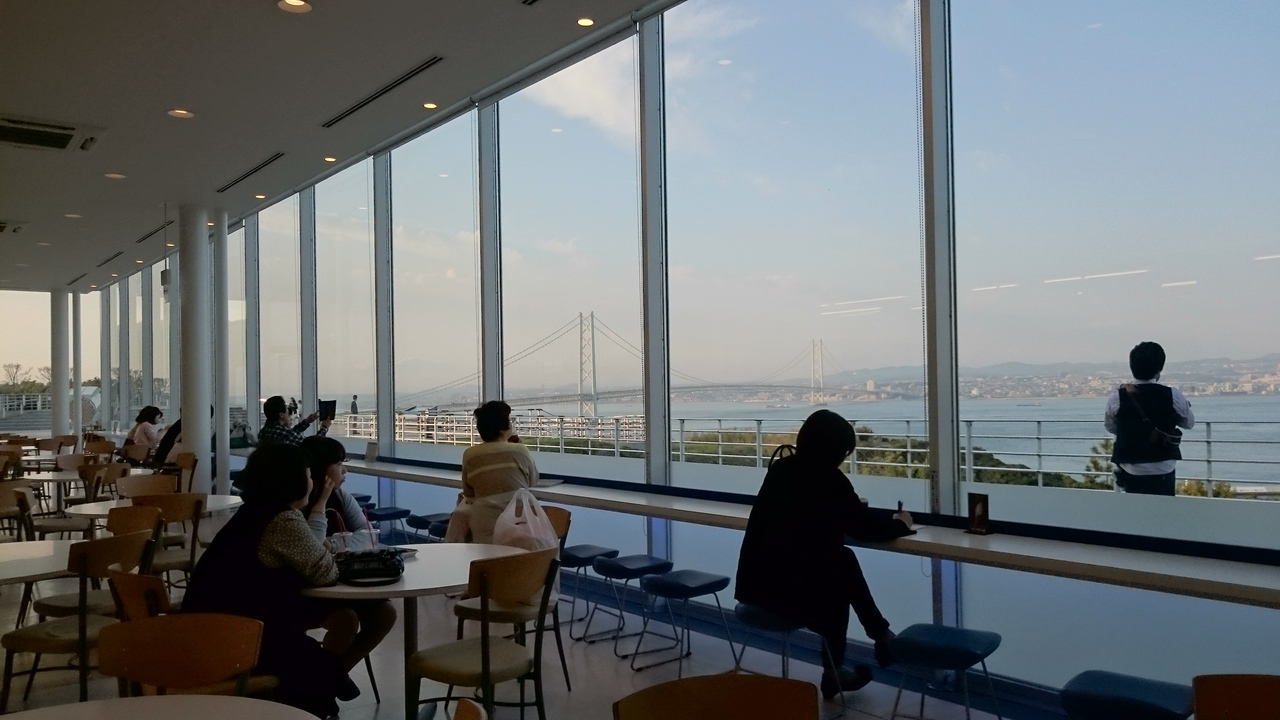カフェスペースがガラス張りで、明石海峡大橋が見えます。外にも出られるみたいです。
